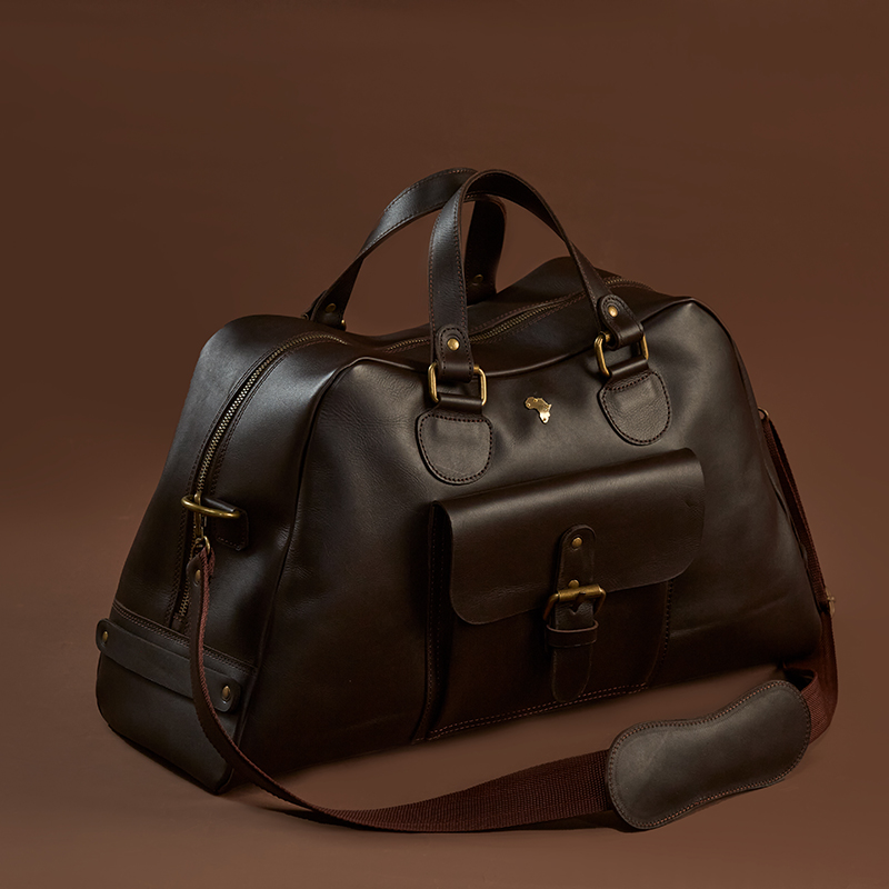 The Mugisha travel bag is made from  chocolate brown semi aniline  leather .